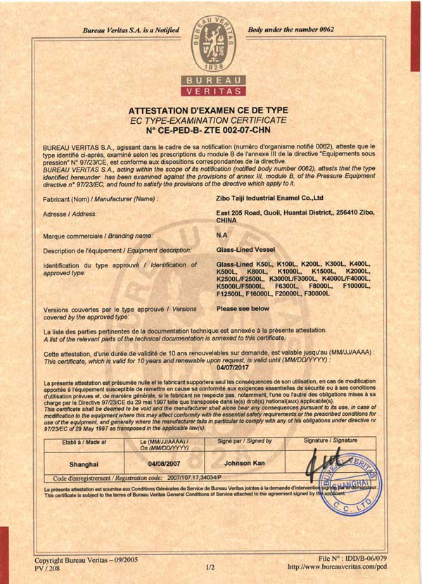 淄博太極在中國搪玻璃設(shè)備制造行業(yè)中首家通過ISO90001質(zhì)量體系認證,并擁有美國ASME認證、歐洲PED認證以及國家部門頒發(fā)的搪玻璃制造許可證、進出口許可證和百余項榮譽證以及三十六項專利等。
